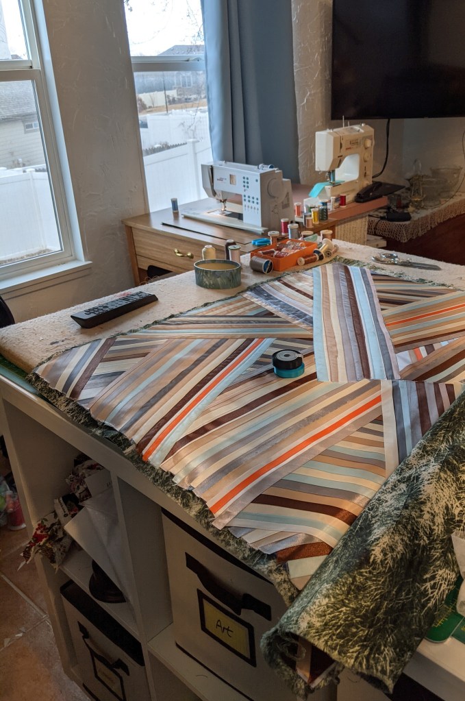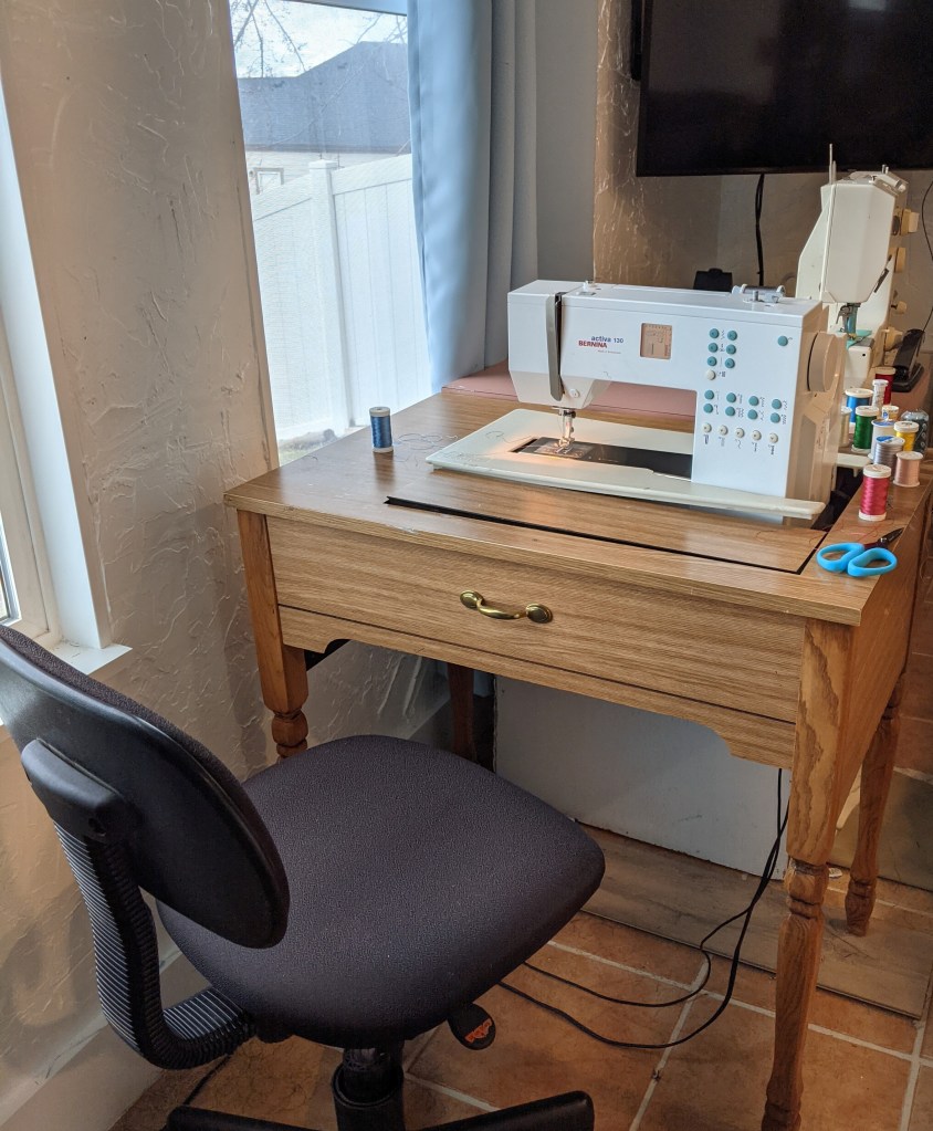I work in a rather small studio space that has excellent light from two north facing windows. I sew with a couple of older workhorse domestic sewing machines. I also “built” a nice cutting/design table by cobbling together 2 Ikea bookcases and an Ikea table top, all bolted and glued together. This unit has a bit of storage underneath for my supplies and tools. I have never kept a large fabric stash but buy what I need as I go. The rest of the room is taken up with my TV, a wood-burning stove, a small china hutch (which holds some of my thrifting treasures), my mother’s cedar chest (built by her father) and a nice chaise lounge where I cuddle my doggie when I watch TV. It’s a small, cozy setup, but it works for me.