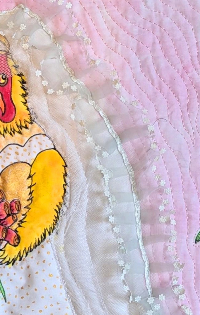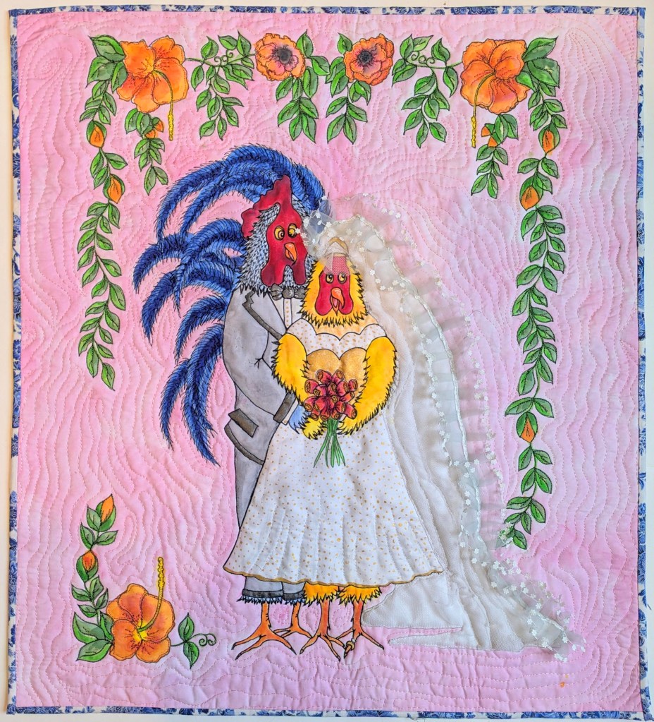 This series consists of whimsical original drawings of chickens doing impossible things. Drawings are transferred to whole cloth white cotton and painted with fabric inks and then stitched.