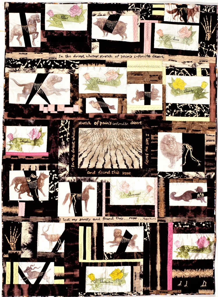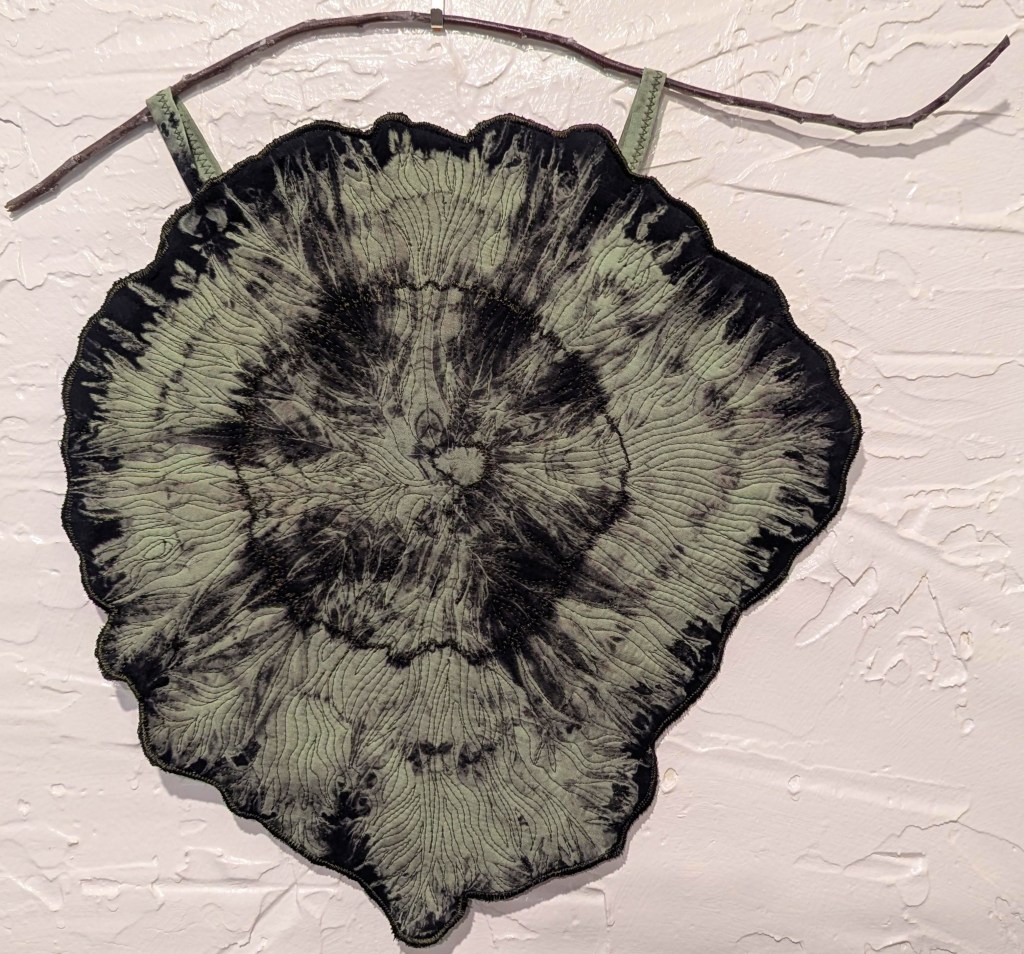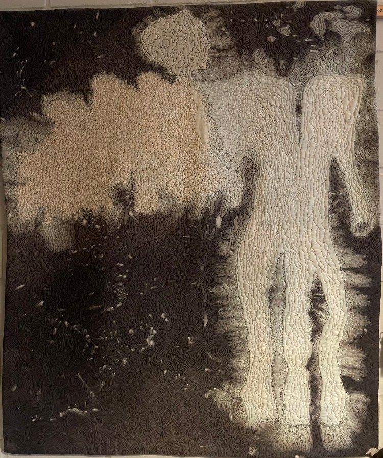 Black cotton whole cloth freehand discharged with painted bleach mixture. Machine quilted on domestic Bernina Activa 130. Have you ever felt you are so out of place, so strange, so different from everyone around you that you might as well be an alien from another planet?