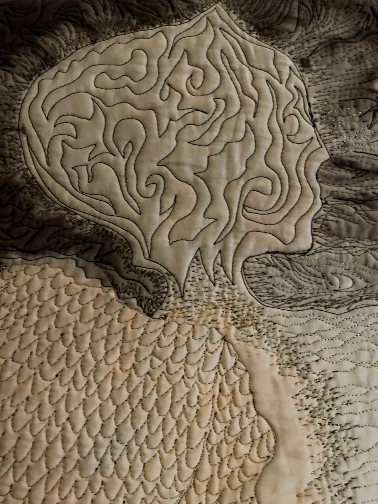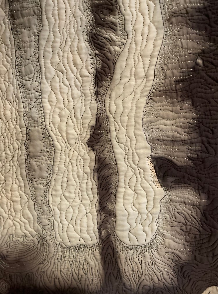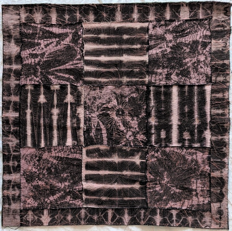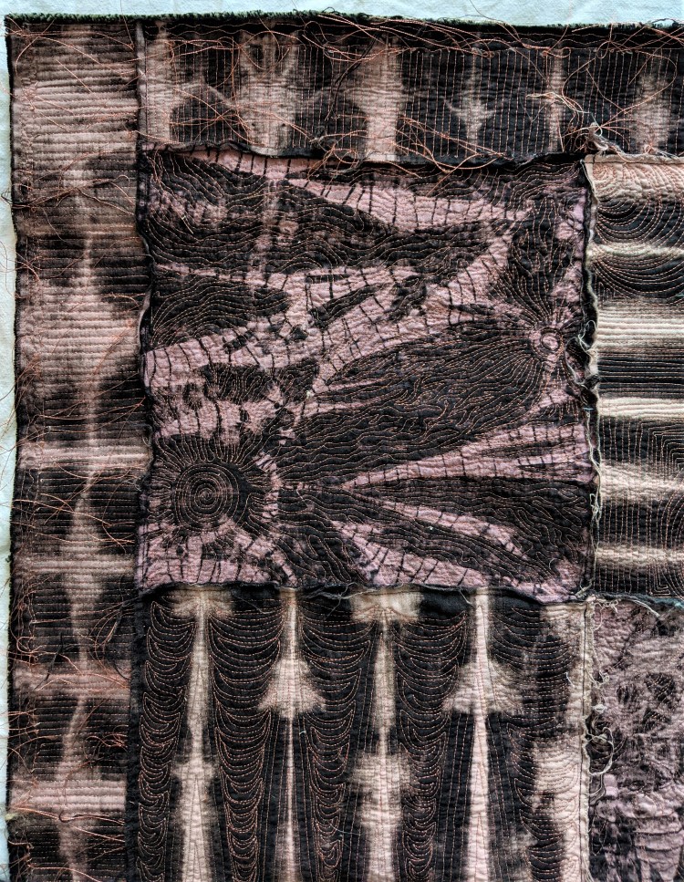 Discharged cotton sewn with seams turned out with loose threads. Machine quilted on domestic Bernina with fine metallic thread.