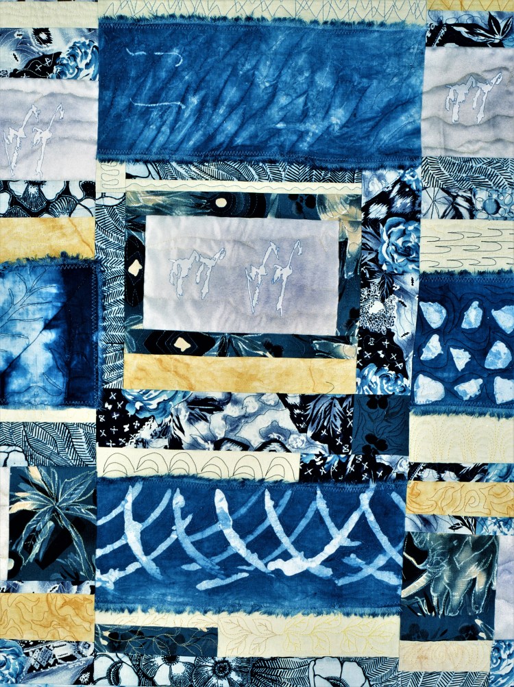 Disperse dye photo transfers on satin with commercial cottons, and raw edge vat dyed indigo cottons and rayons. Stitched on domestic sewing machine.