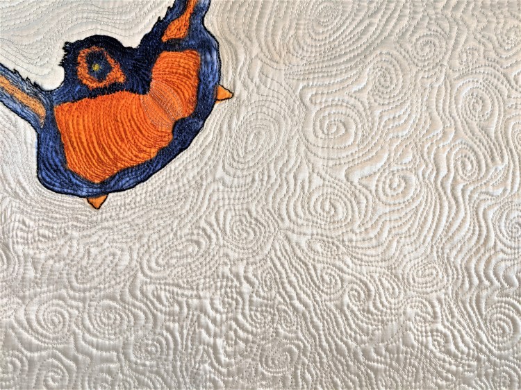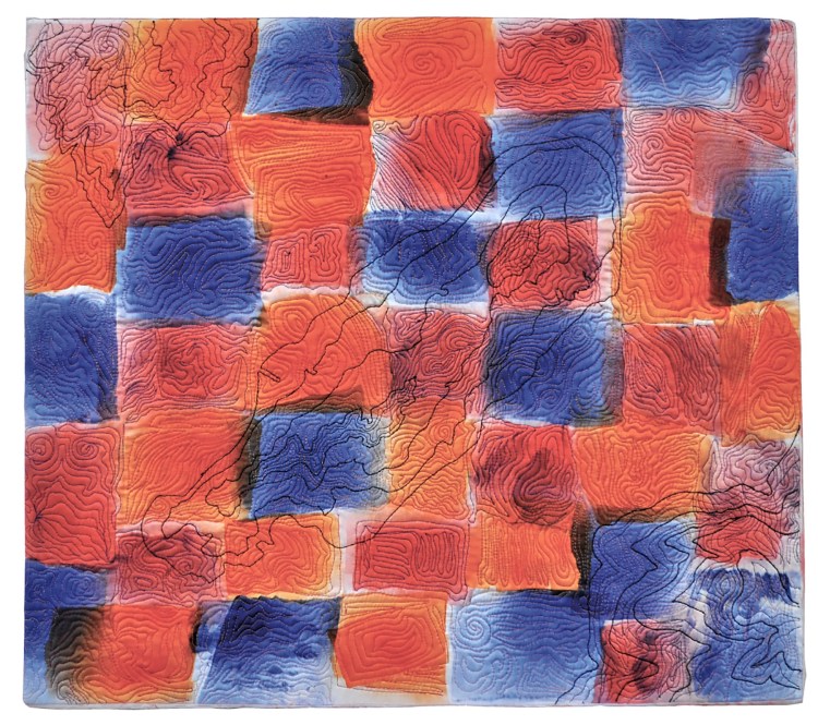 Images printed with a sublimation disperse dye heat transfer process, along with monoprinting. Stitched on domestic sewing machine.
