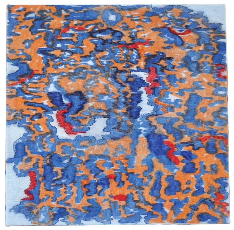 Disperse dye painted on papers and heat transferred onto white satin. Stitched with rayon threads and topstitch thread on domestic sewing machine. Reverse mitered corners and mounted on wood stretcher bars.