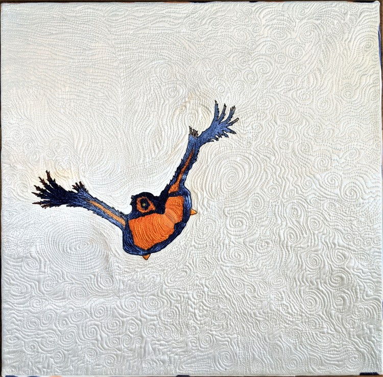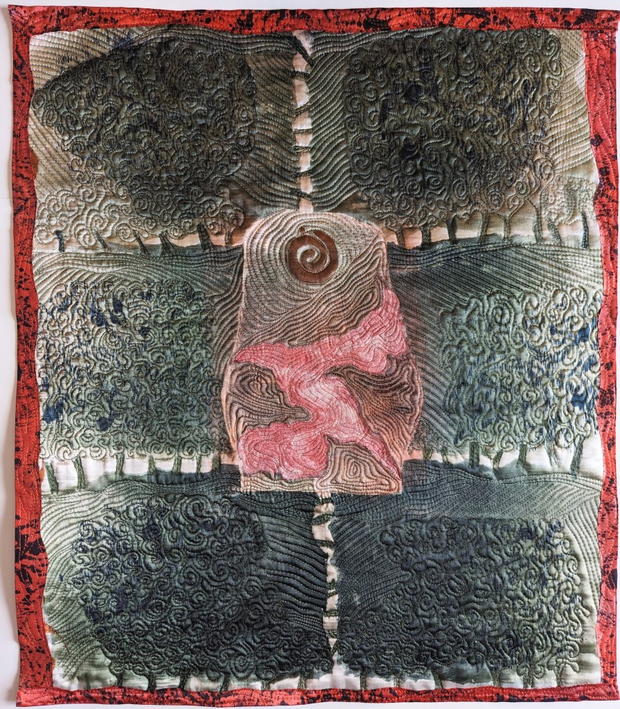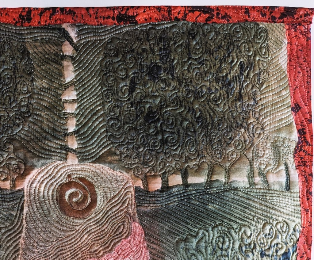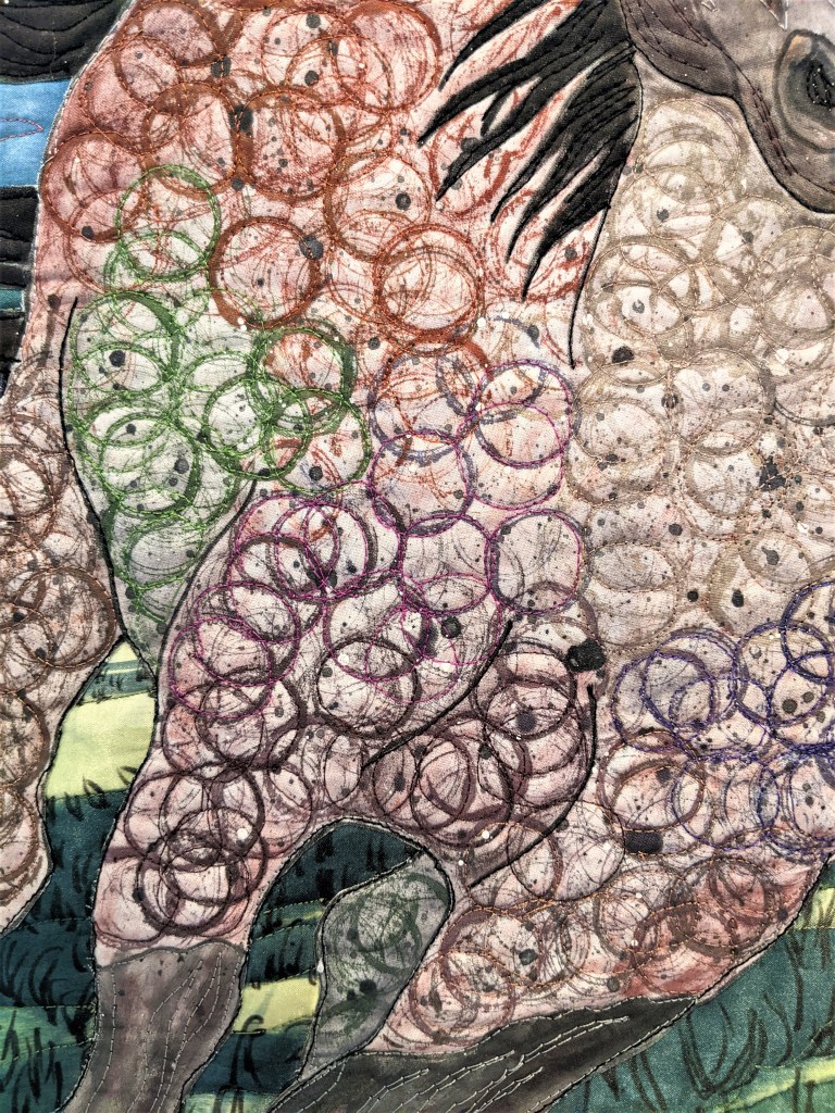 Images made with print transfer and direct painted disperse dyes and monoprinting. Stitched on domestic sewing machine.