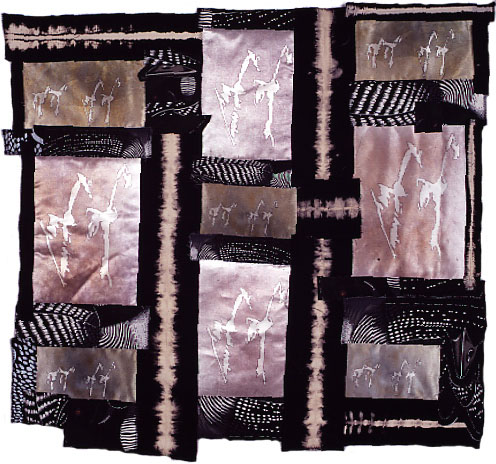 Disperse dye phototransfer (from original drawing) on white satin. Quilted with rayon threads and top stitch thread on domestic sewing machine. Reverse mitered corners and mounted on wood stretcher bars