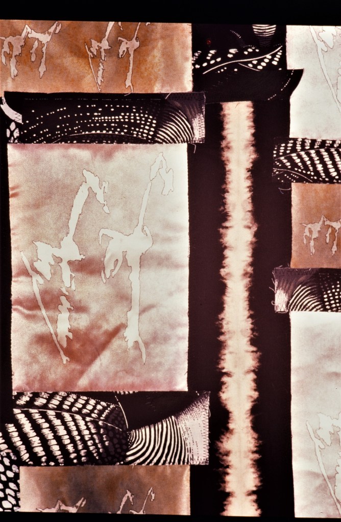 Disperse dye photo transfers on satin with raw edge commercial fabrics and discharge dyed fabrics. Stitched on domestic sewing machine.